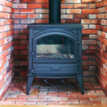 レンガタイルで囲まれたストーブスペースがすごく素敵で、